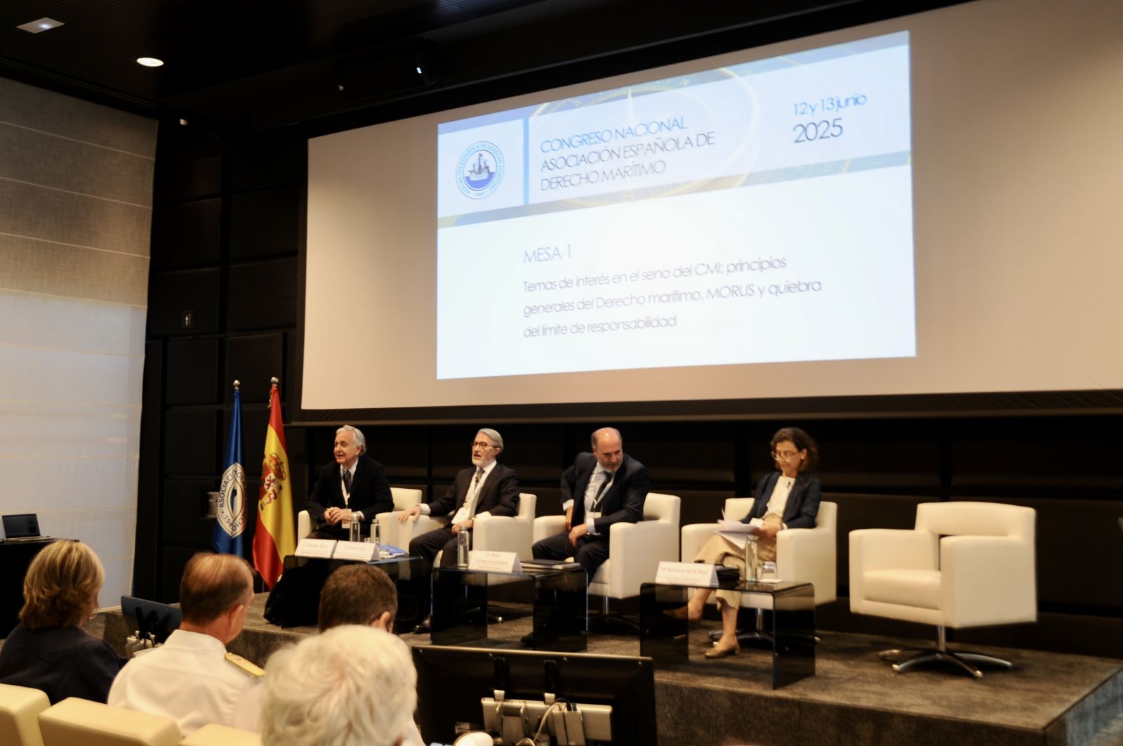 Acto seguido, bajo la moderación de nuestro expresidente, vocal de la Junta y asociado de honor Eduardo Albors, que hasta el 17 de mayo ha servido por dos mandatos consecutivos como consejero del Comité Ejecutivo del CMI, se celebró la primera mesa, que trató de acercar el CMI a nuestros asociados más de lo que ya lo está. Bajo el título “Temas de interés en el seno del CMI: principios generales del Derecho marítimo, MORUS y quiebra del límite de responsabilidad”, en la que fueron ponentes la Prof. Bárbara de la Vega, D. Mikel Garteiz-Goxeaskoa y D. Jesús Casas, se remitieron y pusieron a disposición de los asistentes los Principios de Tokio sobre la Lex Marítima aprobados por la Asamblea del CMI el 17 de mayo de 2025.