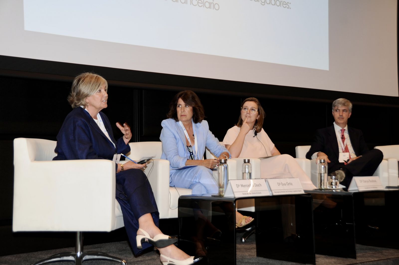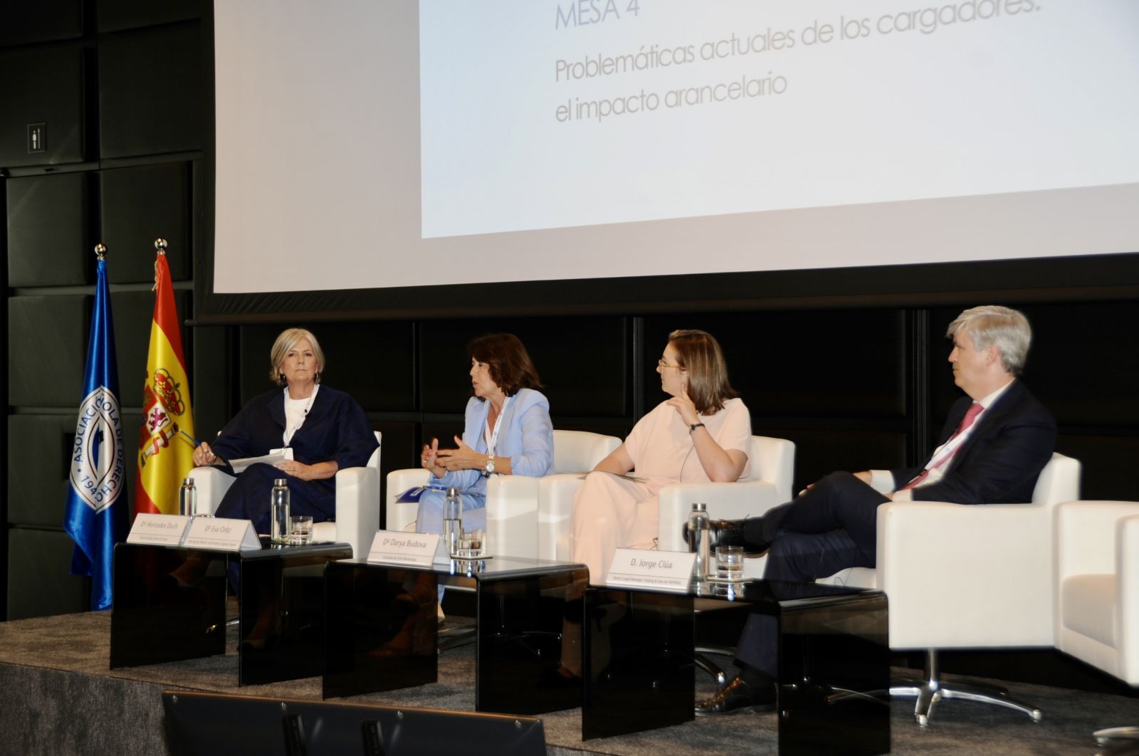 La primera jornada se cerró con la mesa “Problemáticas actuales de los cargadores: impacto arancelario”, moderada por nuestra Vicepresidente Primera, Dña. Mercedes Duch y que contó con las intervenciones de Dña. Eva Ortiz, Dña. Darya Budova y D. Jorge Clúa. Todos ellos expusieron la volatilidad a la que se enfrenta actualmente el negocio marítimo como consecuencia de la denominada “guerra arancelaria” inciada este año, la cual afecta tanto a mercancías como a la construcción naval, repercutiendo así en todo el sector. Esta situación, caracterizada por la impsoibilidad de prever a corto plazo las medidas a adoptar, obliga a redoblar los esfuerzos en un comercio internacional en el que los aranceles pueden afectar a decisiones tácticas y estratégicas de productores, exportadores e importadores.