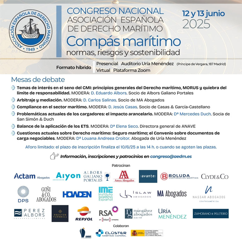 Congreso Nacional 2025 los días 12 y 13 de junio, bajo el lema “Compás marítimo: normas, riesgos y sostenibilidad”. Esta nueva edición tendrá lugar, como es habitual, en el Auditorio Uría Menéndez de Madrid, y también podrá seguirse en formato virtual a través de la plataforma Zoom.